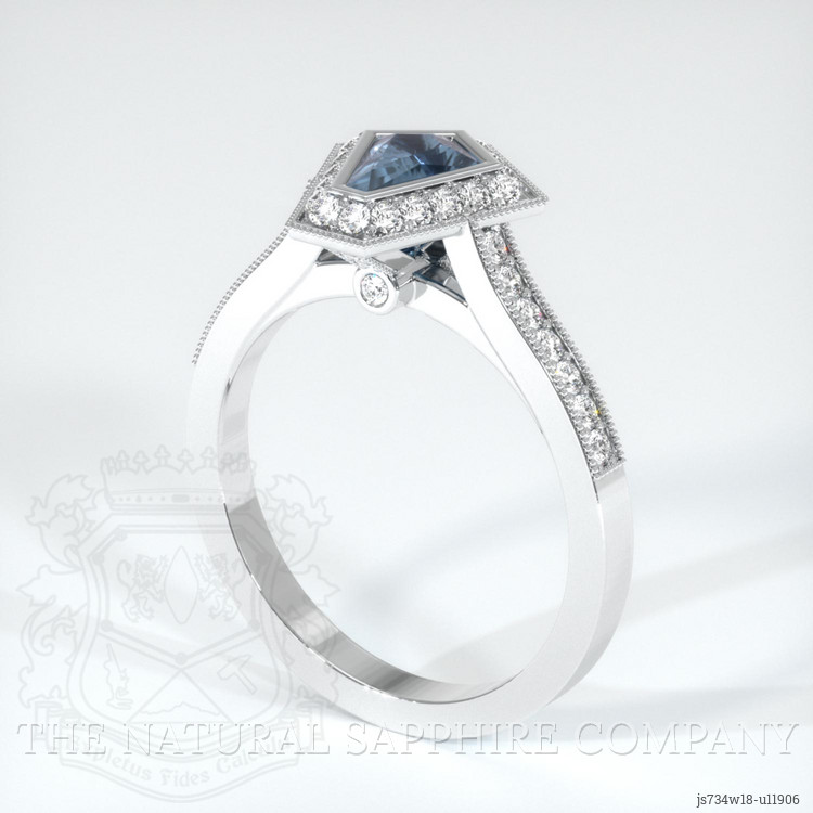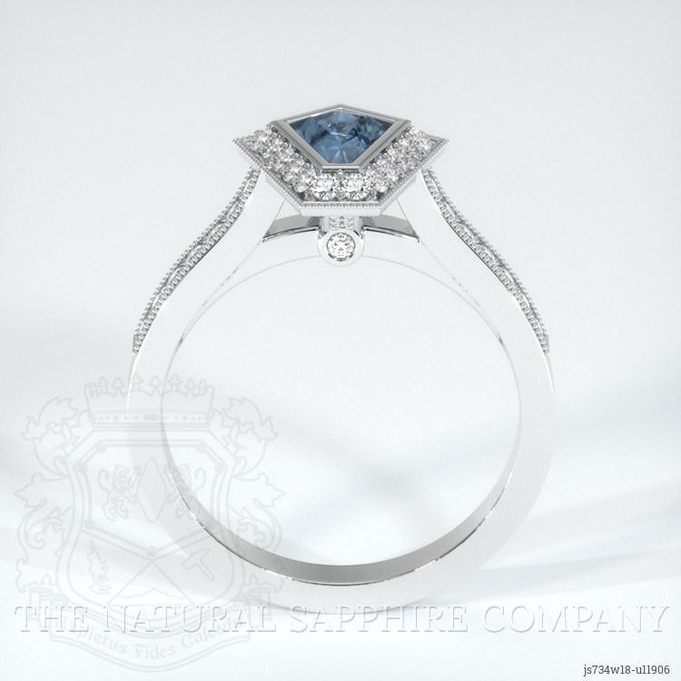 The ring features a beautiful, transparent 0.71 carat fancy shape grayish blue sapphire with the dimensions of 7.09 x 5.48 x 3.42 mm and a fancy brilliant cut. It has a clarity grade of very slightly included (evaluated at eye level), medium color saturation, and an excellent polish. The origin of this sapphire is Montana.
