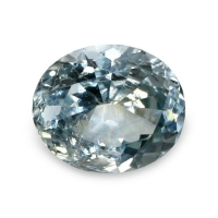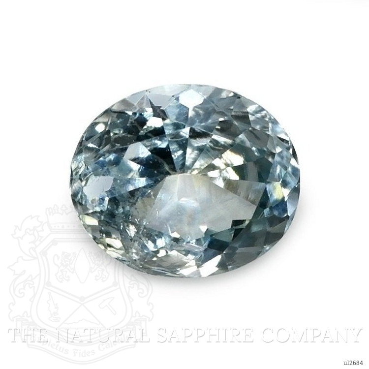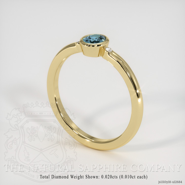 The ring features a beautiful, transparent 0.48 carat oval shape grayish blue sapphire with the dimensions of 5.13 x 4.38 x 2.78 mm and a mixed brilliant cut. It has a clarity grade of slightly included (evaluated at eye level), medium color saturation, and an excellent polish. The origin of this sapphire is Montana.