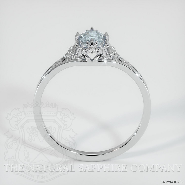 The ring features a beautiful, transparent 0.66 carat oval shape grayish blue sapphire with the dimensions of 5.40 x 4.84 x 3.46 mm and a mixed brilliant cut. It has a clarity grade of eye clean (evaluated at eye level), medium color saturation, and an excellent polish. The origin of this sapphire is Montana.