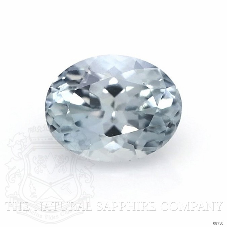 The ring features a beautiful, transparent 0.70 carat oval shape greyish blue sapphire with the dimensions of 5.82 x 4.57 x 3.40 mm and a mixed brilliant cut. It has a clarity grade of eye clean (evaluated at eye level), medium light color saturation, and an excellent polish. The origin of this sapphire is Montana.