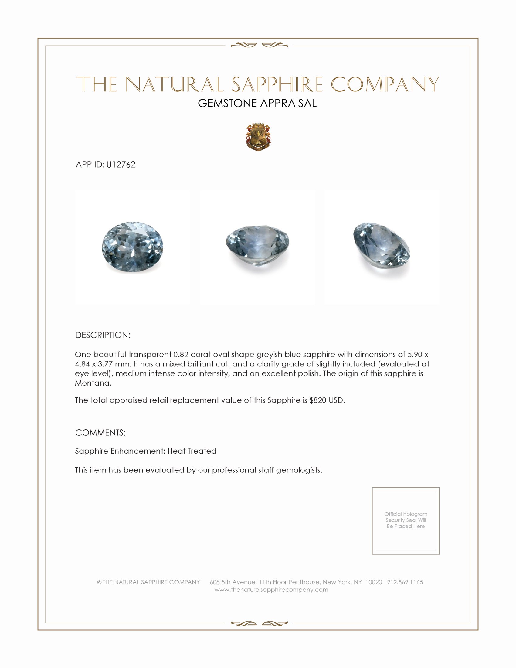 There is a quiet journey behind every gemstone we set, and this ring begins in the cool alluvial gravels and mountain veins of Montana, where nature slowly shaped a rare, greyish blue sapphire over millions of years. The oval sapphire at the heart of this piece weighs 0.82 carat, and measures 5.90 x 4.84 x 3.77 mm, its mixed brilliant cut motioning light into a sparkle that feels alive. At eye level the stone carries a slightly included clarity, a detail that speaks to its natural origin rather than concealment, and the medium intense color saturation gives it a soft, maritime blue that shifts with the angle of light. Our lapidaries have given the stone an excellent polish to enhance that subtle shimmer, and like many of the most enduring sapphires, it has been heat treated to fully reveal its depth and character. When you hold this sapphire, you are holding mineral time, a piece of Montana folded into brilliance, with all of the small inclusions acting as a map of its formation, a fingerprint that cannot be duplicated.