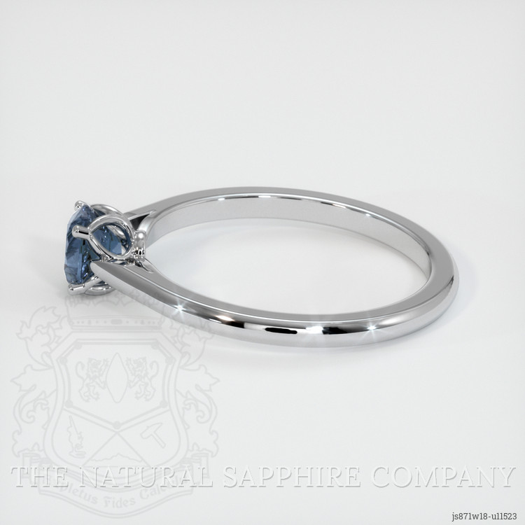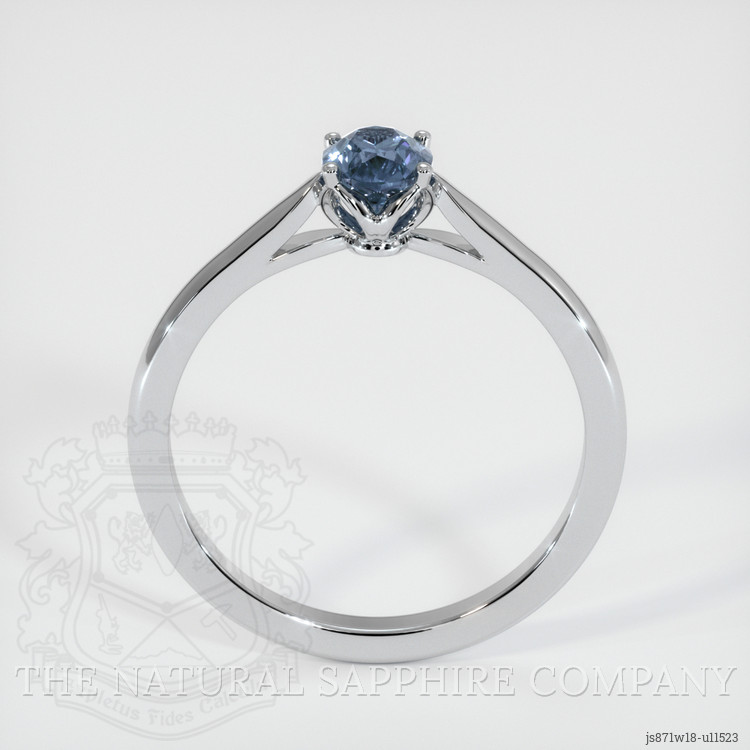 The ring features a beautiful, transparent 0.90 carat oval shape greyish blue sapphire with the dimensions of 5.79 x 5.19 x 3.87 mm and a mixed brilliant cut. It has a clarity grade of very slightly included (evaluated at eye level), intense color saturation, and an excellent polish. The origin of this sapphire is Montana.