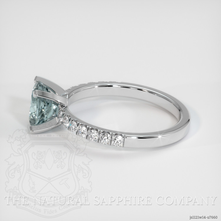 The ring features a beautiful, transparent 1.06 carat oval shape greyish blue sapphire with the dimensions of 6.52 x 5.72 x 3.67 mm and a mixed brilliant cut. It has a clarity grade of very slightly included (evaluated at eye level), light color saturation, and an excellent polish. The origin of this sapphire is Montana.