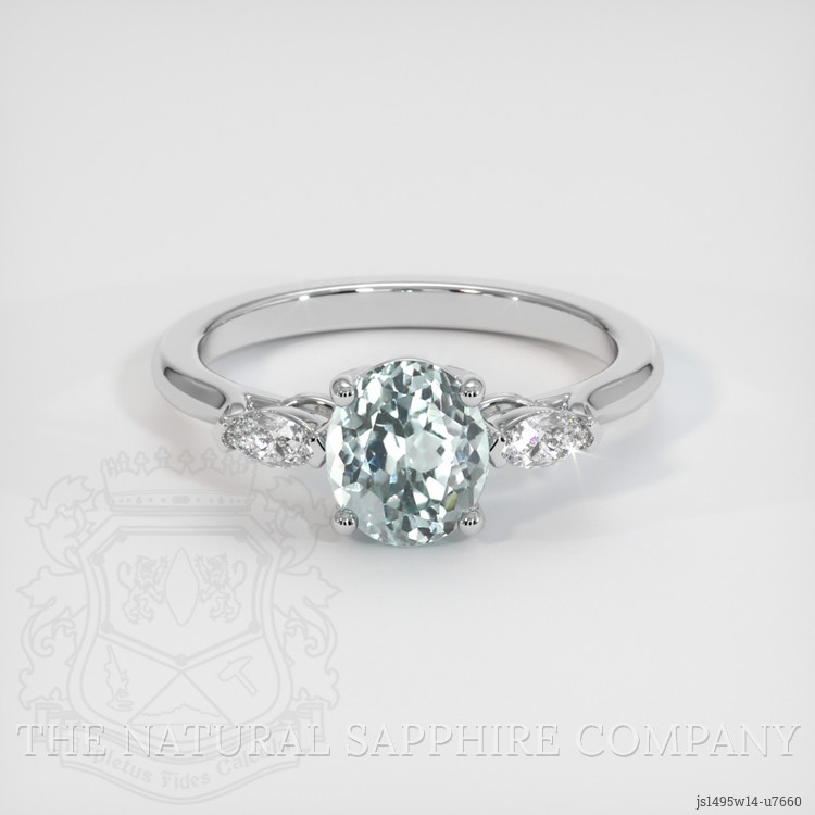 The ring features a beautiful, transparent 1.06 carat oval shape greyish blue sapphire with the dimensions of 6.52 x 5.72 x 3.67 mm and a mixed brilliant cut. It has a clarity grade of very slightly included (evaluated at eye level), light color saturation, and an excellent polish. The origin of this sapphire is Montana.