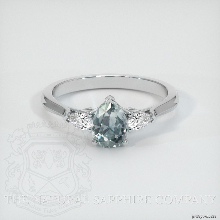 The ring features a beautiful, transparent 0.84 carat pear shape greyish blue sapphire with the dimensions of 6.72 x 5.10 x 3.41 mm and a mixed brilliant cut. It has a clarity grade of eye clean (evaluated at eye level), medium color saturation, and an excellent polish. The origin of this sapphire is Montana.