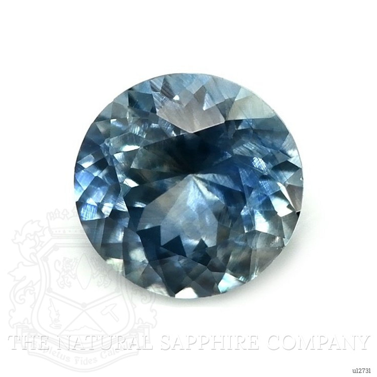 The ring features a beautiful, transparent 0.55 carat round shape greyish blue sapphire with the dimensions of 5.04 x 5.00 x 3.11 mm and a mixed brilliant cut. It has a clarity grade of eye clean (evaluated at eye level), medium color saturation, and an excellent polish. The origin of this sapphire is Montana.