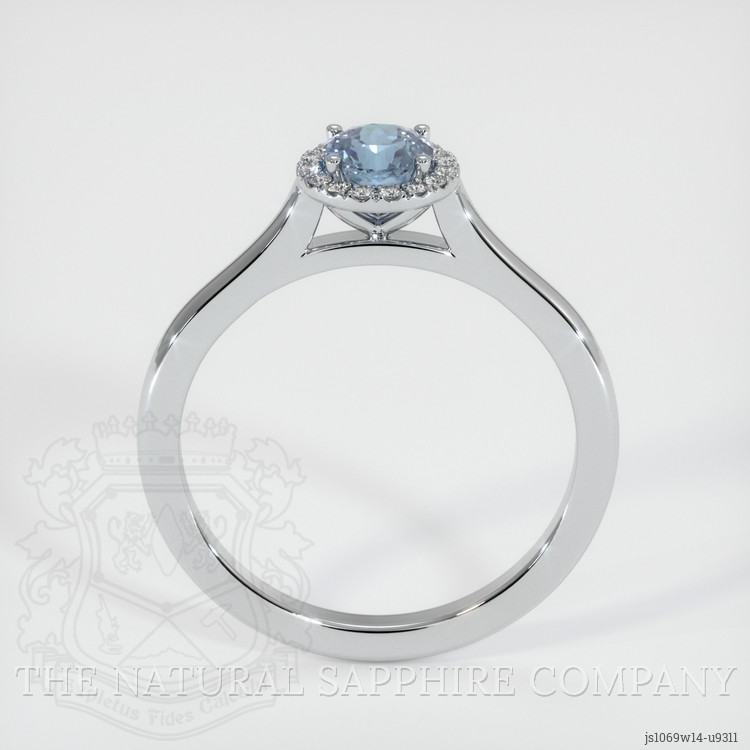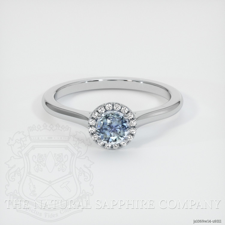 The ring features a beautiful, transparent 0.60 carat round shape greyish blue sapphire with the dimensions of 4.96 x 4.93 x 3.40 mm and a modified brilliant cut. It has a clarity grade of eye clean (evaluated at eye level), medium color saturation, and an excellent polish. The origin of this sapphire is Montana.