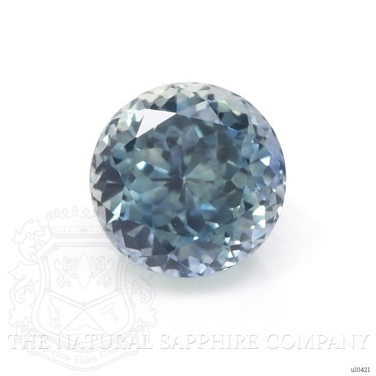 The ring features a beautiful, transparent 0.60 carat round shape greyish blue sapphire with the dimensions of 4.73 x 4.68 x 3.53 mm and a mixed brilliant cut. It has a clarity grade of eye clean (evaluated at eye level), medium intense color saturation, and an excellent polish. The origin of this sapphire is Montana.