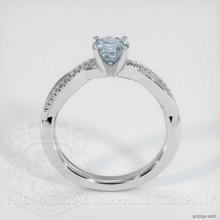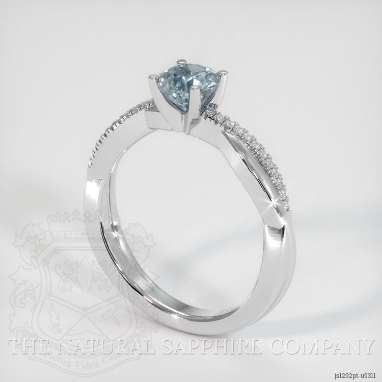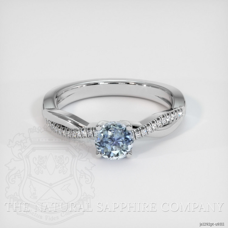 The ring features a beautiful, transparent 0.60 carat round shape grayish blue sapphire with the dimensions of 4.96 x 4.93 x 3.40 mm and a modified brilliant cut. It has a clarity grade of eye clean (evaluated at eye level), medium color saturation, and an excellent polish. The origin of this sapphire is Montana.