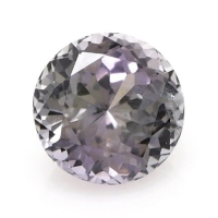 The ring features a beautiful, transparent 0.76 carat round shape greyish blue sapphire with the dimensions of 5.44 x 5.36 x 3.57 mm and a modified brilliant cut. It has a clarity grade of very slightly included (evaluated at eye level), medium color saturation, and an excellent polish. The origin of this sapphire is Ceylon (Sri Lanka).