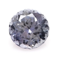 The ring features a beautiful, transparent 0.77 carat round shape greyish blue sapphire with the dimensions of 5.72 x 5.67 x 3.47 mm and a modified brilliant cut. It has a clarity grade of very slightly included (evaluated at eye level), medium color saturation, and an excellent polish. The origin of this sapphire is Ceylon (Sri Lanka).