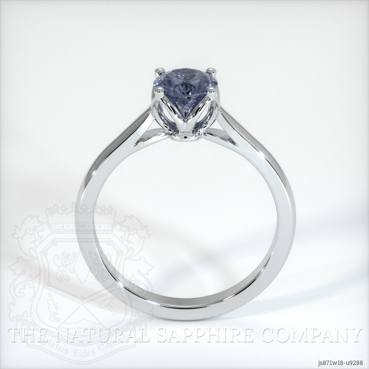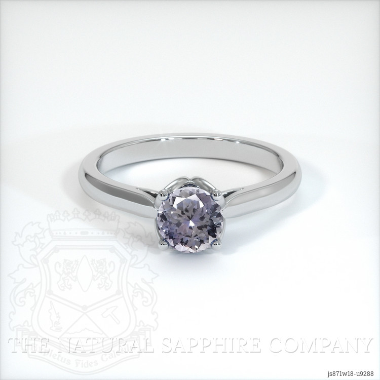 The ring features a beautiful, transparent 0.77 carat round shape greyish blue sapphire with the dimensions of 5.72 x 5.67 x 3.47 mm and a modified brilliant cut. It has a clarity grade of very slightly included (evaluated at eye level), medium color saturation, and an excellent polish. The origin of this sapphire is Ceylon (Sri Lanka).