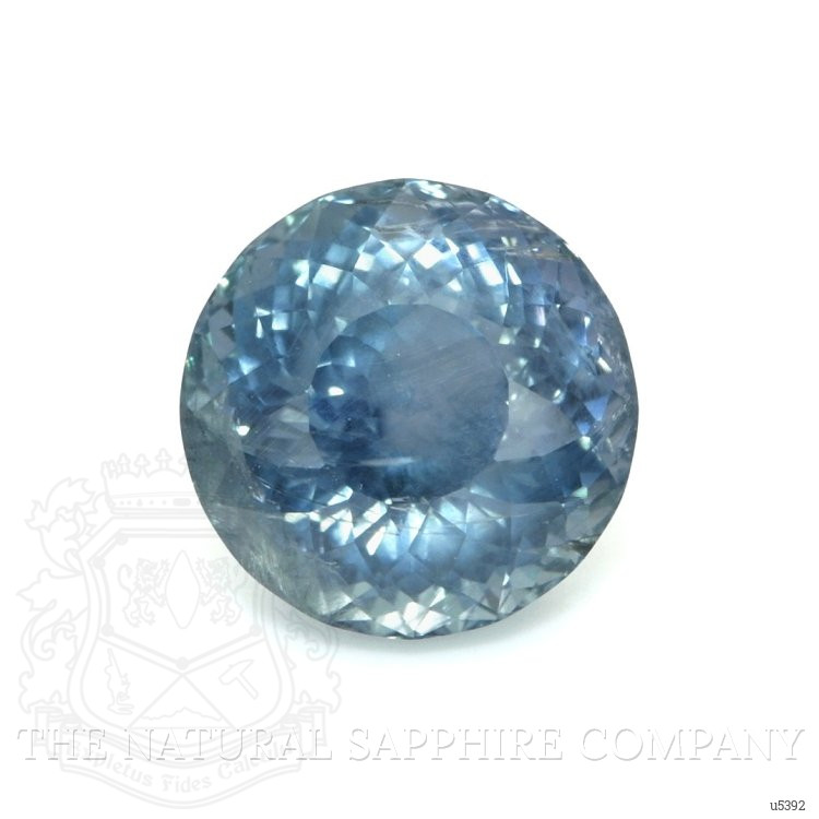 The ring features a beautiful, transparent 6.99 carat round shape greyish blue sapphire with the dimensions of 10.17 x 10.03 x 8.45 mm and a mixed brilliant cut. It has a clarity grade of very slightly included (evaluated at eye level), intense color saturation, and an excellent polish. The origin of this sapphire is Montana.