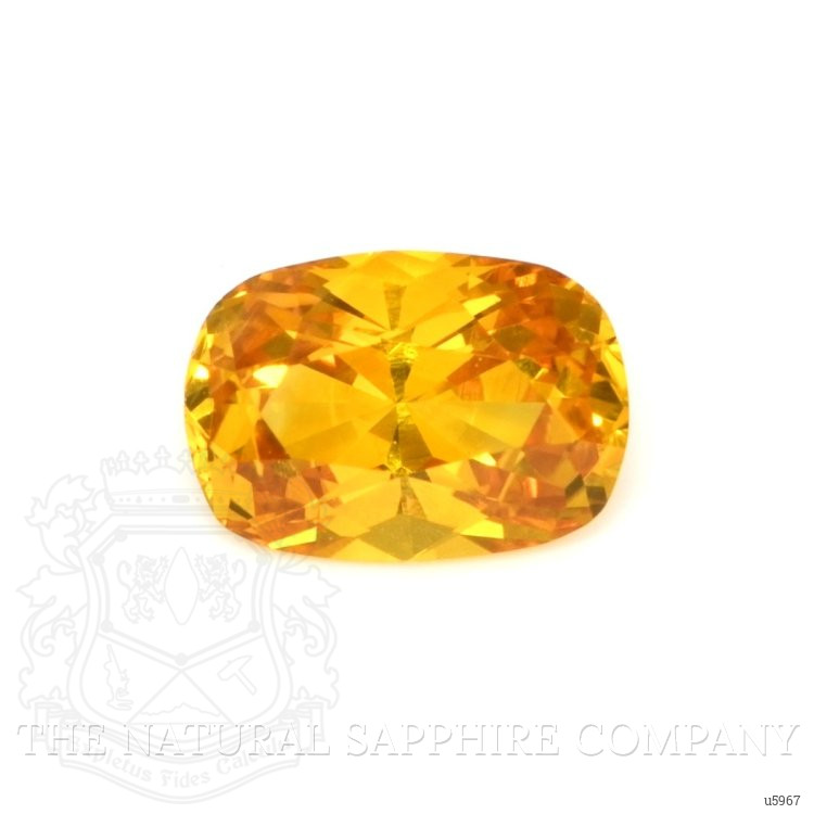 The pendant features a beautiful, transparent 1.03 carat cushion shape orange sapphire with the dimensions of 6.97 x 4.89 x 3.74 mm and a mixed brilliant cut. It has a clarity grade of very slightly included (evaluated at eye level), intense color saturation, and an excellent polish. The origin of this sapphire is Ceylon (Sri Lanka).