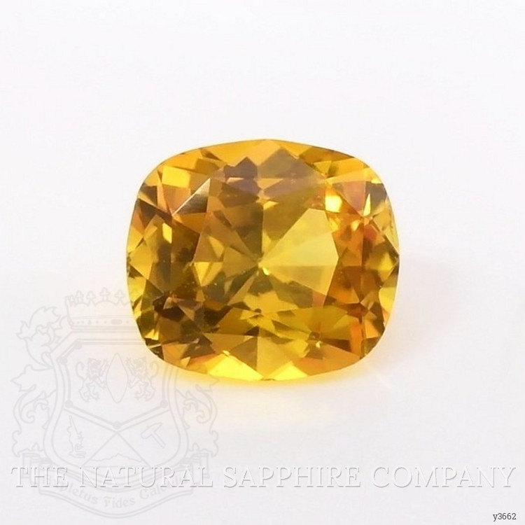 The ring features a beautiful, transparent 0.70 carat cushion shape orange sapphire with the dimensions of 5.66 x 4.99 x 3.21 mm and a mixed brilliant cut. It has a clarity grade of eye clean (evaluated at eye level), vivid color saturation, and an excellent polish. The origin of this sapphire is Ceylon (Sri Lanka).
