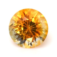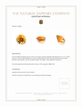 The ring features a beautiful, transparent 0.63 carat round shape orange sapphire with the dimensions of 5.13 x 5.08 x 3.64 mm and a mixed brilliant cut. It has a clarity grade of eye clean (evaluated at eye level), intense color saturation, and an excellent polish. The origin of this sapphire is Montana.