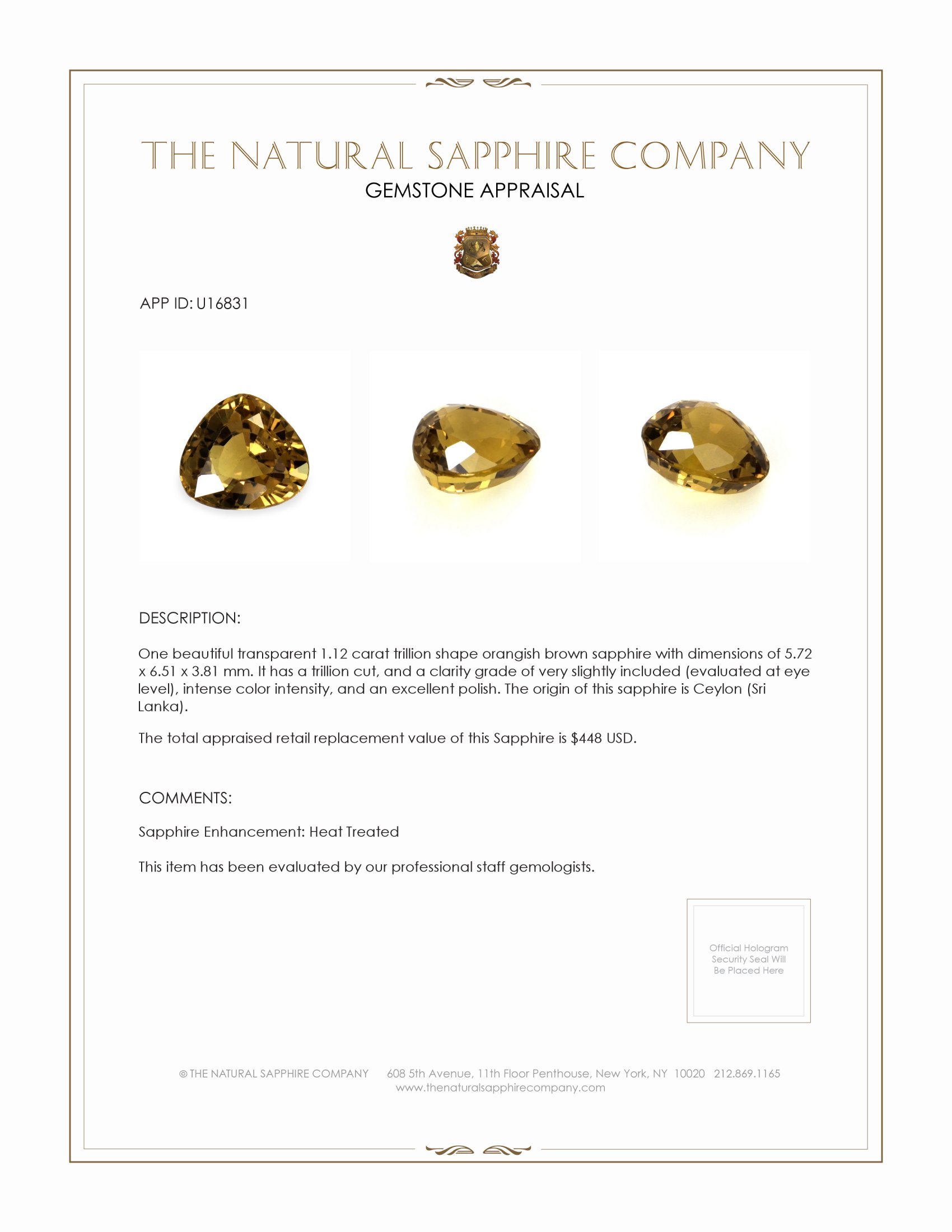 The centerpiece of this extraordinary creation is a 1.12-carat trillion-shaped sapphire, hailing from the renowned gem-producing region of Ceylon, Sri Lanka. This gemstone's unique color—an alluring orangish brown—emits an intense, vibrant glow that captivates the eye and demands to be admired. Expertly cut into a trillion shape, the sapphire measures 5.72 x 6.51 x 3.81 mm and features an exceptional polish that highlights its natural luminosity. With a clarity grade of very slightly included, the stone is virtually flawless to the naked eye, ensuring that its splendor shines through in every setting.