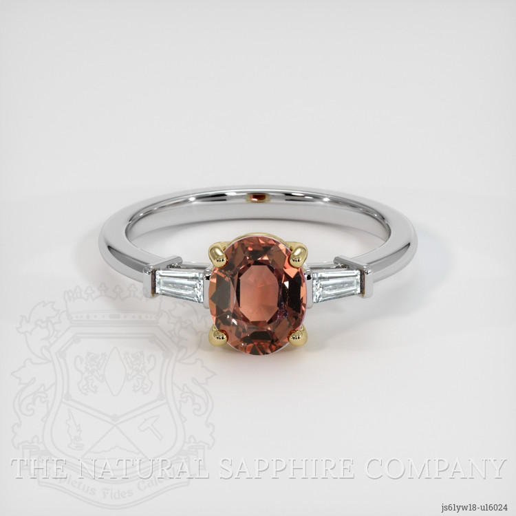 The ring features a beautiful, transparent 1.34 carat oval shape orangish brown sapphire with the dimensions of 7.26 x 5.98 x 3.70 mm and a mixed brilliant cut. It has a clarity grade of eye clean (evaluated at eye level), intense color saturation, and an excellent polish. The origin of this sapphire is Ceylon (Sri Lanka).