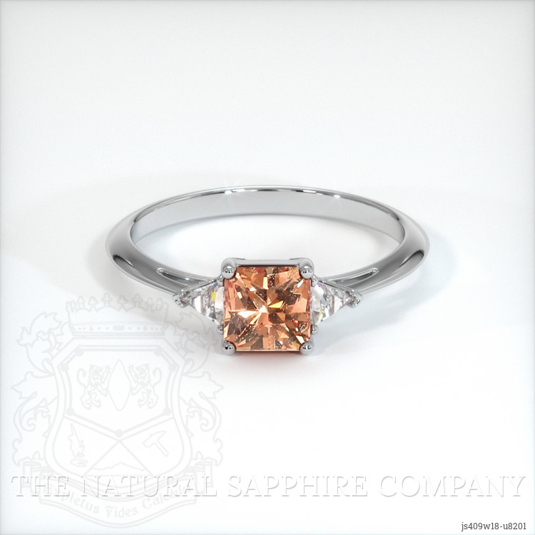 The ring features a beautiful, transparent 0.97 carat radiant shape orangish brown sapphire with the dimensions of 5.03 x 4.97 x 3.98 mm and a radiant cut. It has a clarity grade of very slightly included (evaluated at eye level), medium intense color saturation, and an excellent polish. The origin of this sapphire is Madagascar.