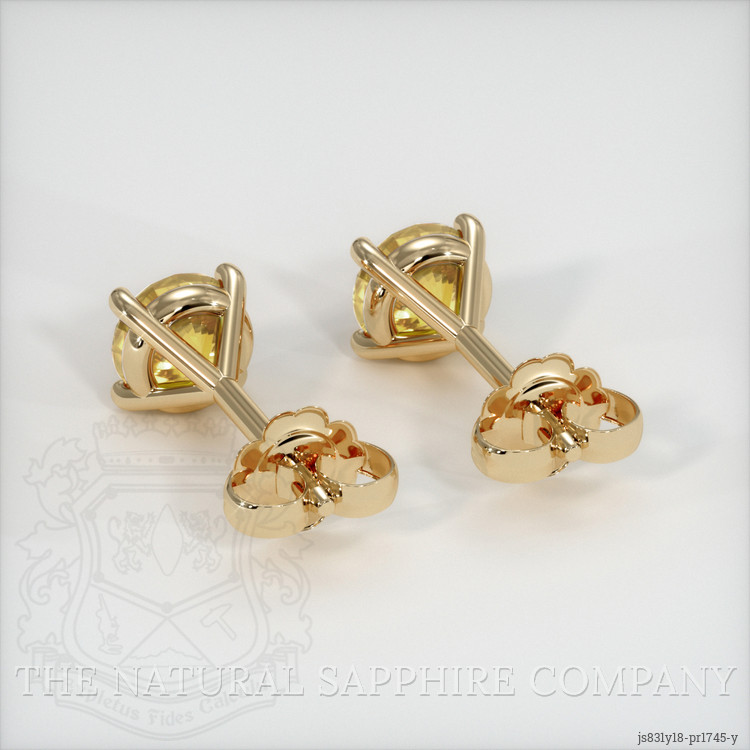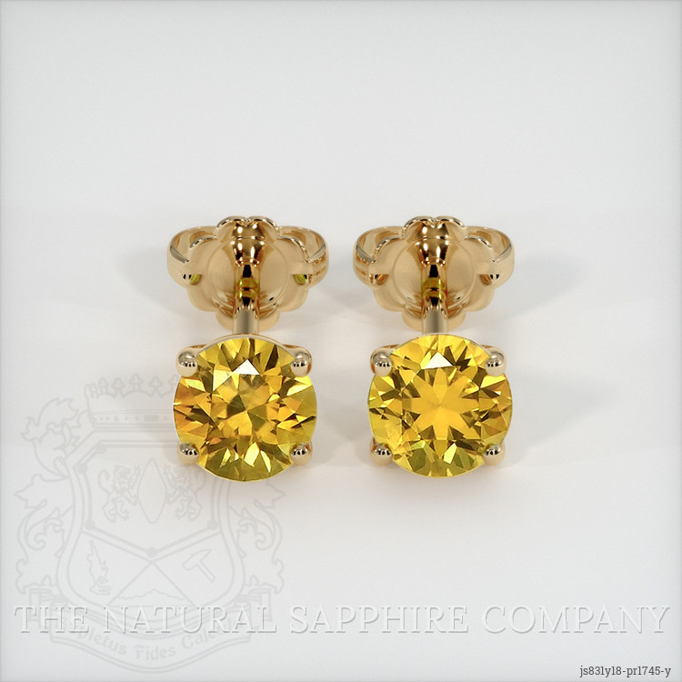 The earrings feature a beautiful, transparent pair of sapphires that are 1.21 total carat weight. They are round shape orangish yellow sapphires, with the dimensions of 5.11 x 5.04 x 3.53 mm and are brilliant cut, have a clarity grade of very slightly included (evaluated at eye level), intense color saturation, and an excellent polish. The origin of this pair of sapphires is Ceylon (Sri Lanka).