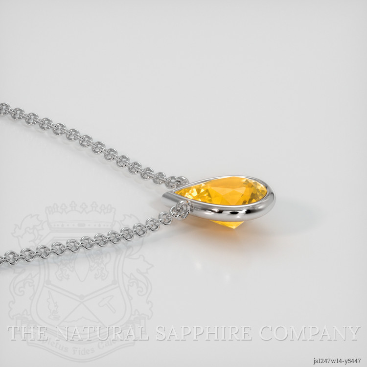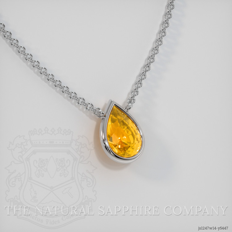 The necklace features a beautiful, transparent 0.87 carat pear shape orangish yellow sapphire with the dimensions of 7.12 x 5.21 x 3.72 mm and a mixed brilliant cut. It has a clarity grade of eye clean (evaluated at eye level), medium color saturation, and an excellent polish. The origin of this sapphire is Ceylon (Sri Lanka).