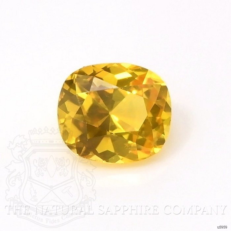 The ring features a beautiful, transparent 0.57 carat cushion shape orangish yellow sapphire with the dimensions of 5.10 x 4.50 x 3.10 mm and a mixed brilliant cut. It has a clarity grade of very slightly included (evaluated at eye level), vivid color saturation, and an excellent polish. The origin of this sapphire is Ceylon (Sri Lanka).