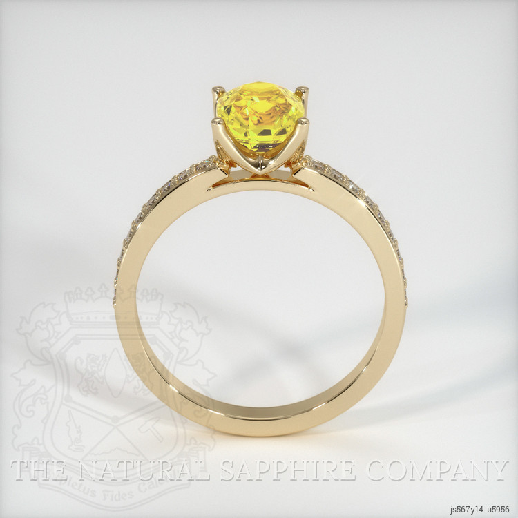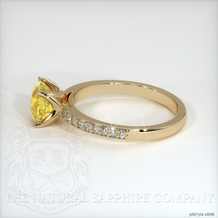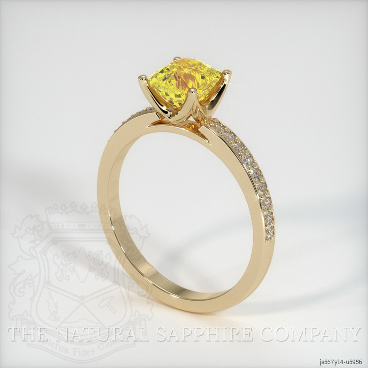 The ring features a beautiful, transparent 1.47 carat cushion shape orangish yellow sapphire with the dimensions of 6.47 x 5.77 x 4.63 mm and a mixed brilliant cut. It has a clarity grade of eye clean (evaluated at eye level), intense color saturation, and an excellent polish. The origin of this sapphire is Ceylon (Sri Lanka).