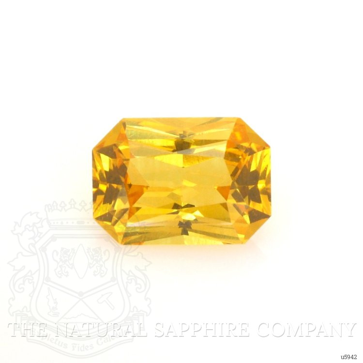 The ring features a beautiful, transparent 1.03 carat radiant shape orangish yellow sapphire with the dimensions of 7.00 x 4.97 x 3.22 mm and a radiant cut. It has a clarity grade of eye clean (evaluated at eye level), vivid color saturation, and an excellent polish. The origin of this sapphire is Ceylon (Sri Lanka).