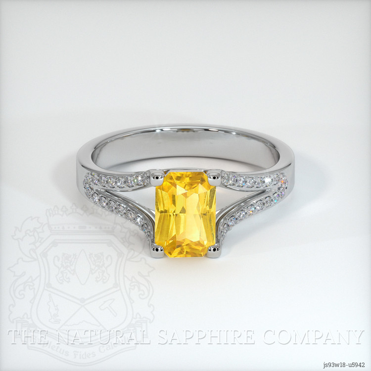 The ring features a beautiful, transparent 1.03 carat radiant shape orangish yellow sapphire with the dimensions of 7.00 x 4.97 x 3.22 mm and a radiant cut. It has a clarity grade of eye clean (evaluated at eye level), vivid color saturation, and an excellent polish. The origin of this sapphire is Ceylon (Sri Lanka).