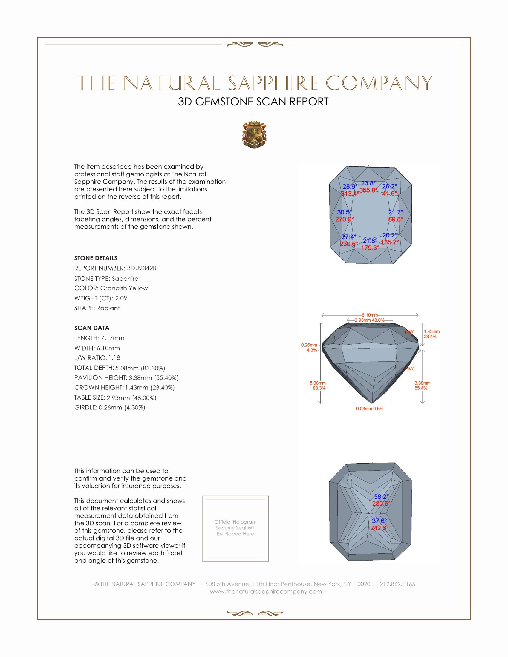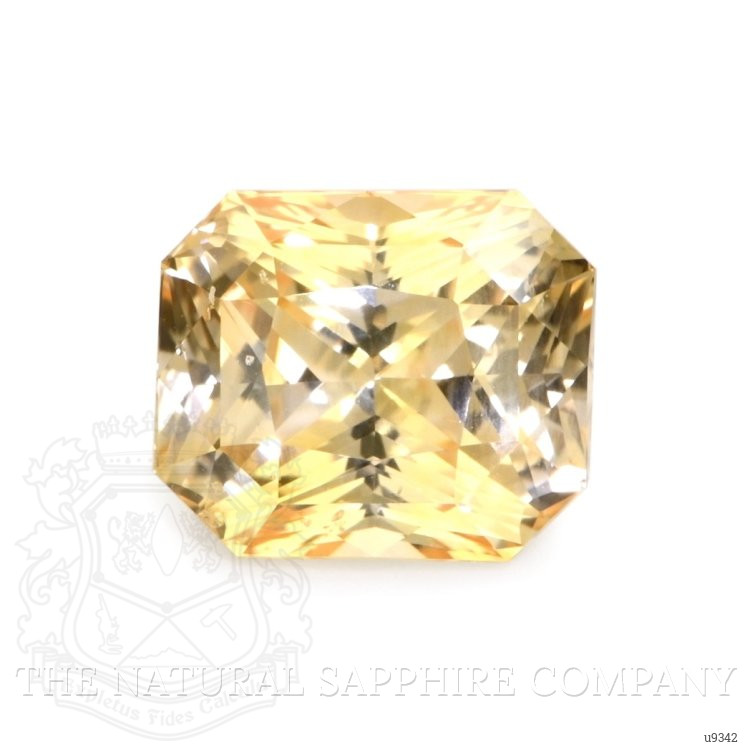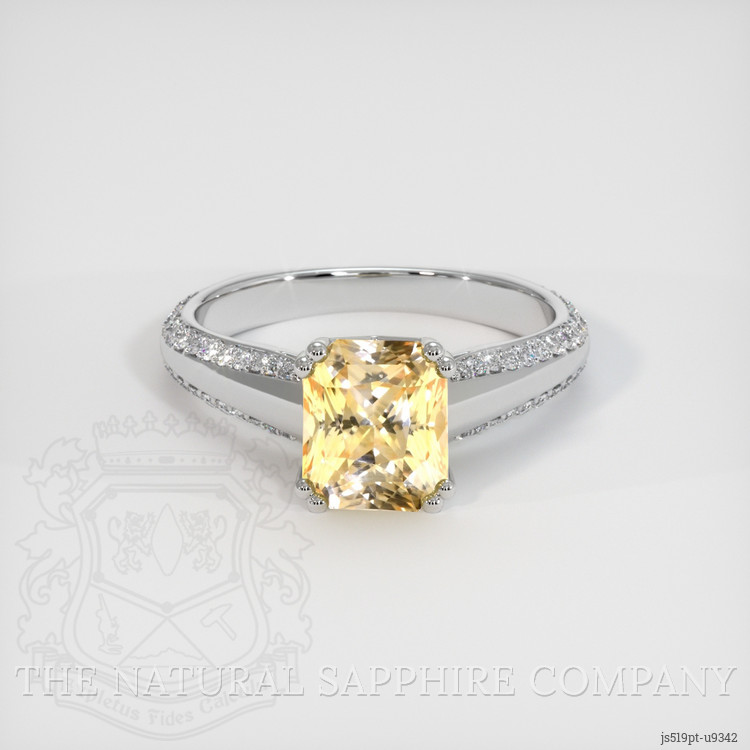 The ring features a beautiful, transparent 2.09 carat radiant shape orangish yellow sapphire with the dimensions of 7.17 x 6.10 x 5.08 mm and a radiant cut. It has a clarity grade of very slightly included (evaluated at eye level), medium intense color saturation, and an excellent polish. The origin of this sapphire is Ceylon (Sri Lanka).