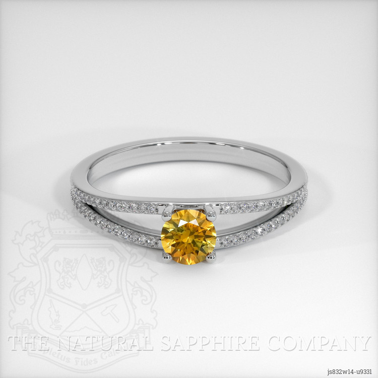 The ring features a beautiful, transparent 0.61 carat round shape orangish yellow sapphire with the dimensions of 5.20 x 5.19 x 3.42 mm and a brilliant cut. It has a clarity grade of very slightly included (evaluated at eye level), intense color saturation, and an excellent polish. The origin of this sapphire is Montana.