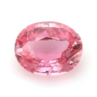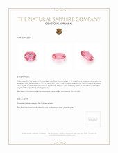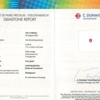 The necklace features a beautiful, transparent C.Dunaigre certified Pink-Orange 1.13 carat oval shape padparadscha sapphire with the dimensions of 7.11 x 5.66 x 3.21 mm and a mixed brilliant cut. It has a clarity grade of eye clean (evaluated at eye level), intense color saturation, and an excellent polish. The origin of this sapphire is Madagascar.