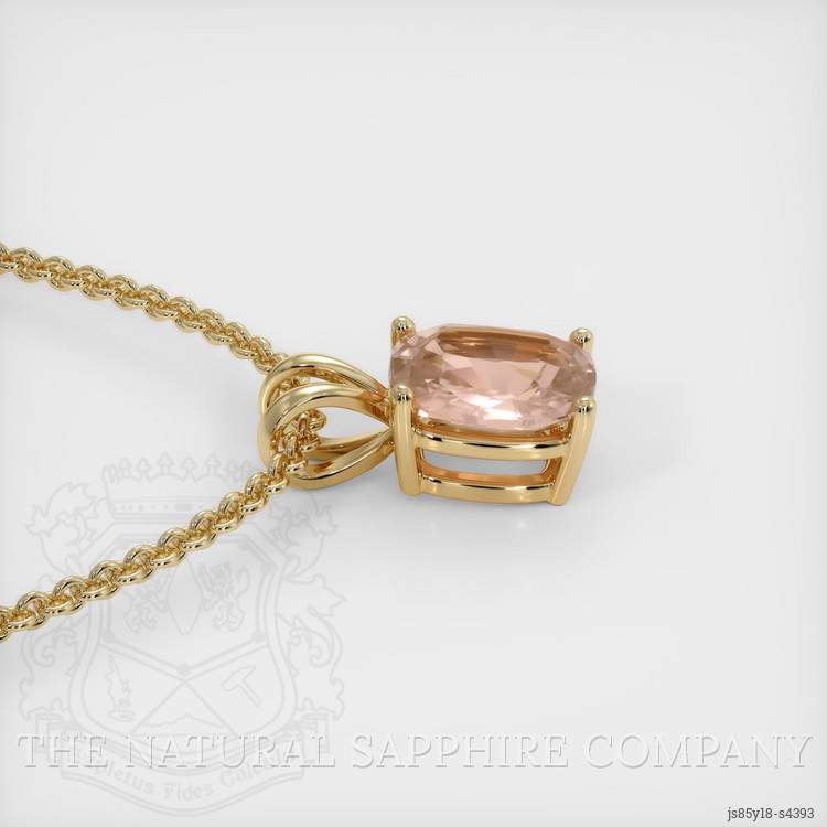The pendant features a beautiful, transparent Other certified Pinkish Orange 1.58 carat cushion shape padparadscha sapphire with the dimensions of 7.42 x 6.64 x 3.32 mm and a mixed brilliant cut. It has a clarity grade of eye clean (evaluated at eye level), medium light color saturation, and an excellent polish. The origin of this sapphire is Ceylon (Sri Lanka).