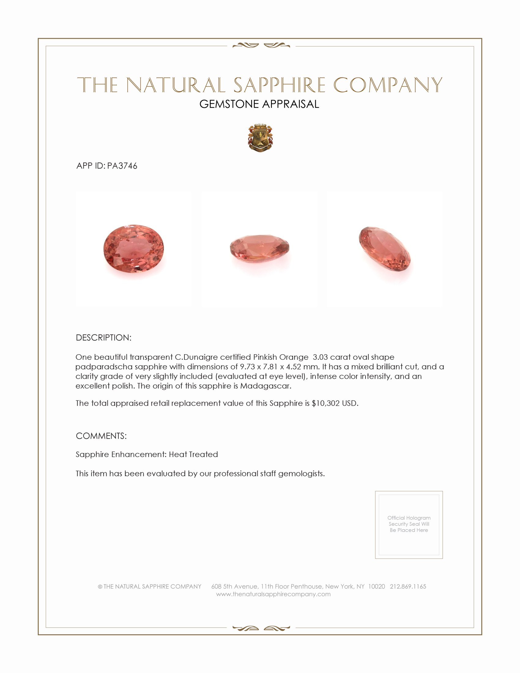 The pendant features a beautiful, transparent C.Dunaigre certified Pinkish Orange 3.03 carat oval shape padparadscha sapphire with the dimensions of 9.73 x 7.81 x 4.52 mm and a mixed brilliant cut. It has a clarity grade of very slightly included (evaluated at eye level), intense color saturation, and an excellent polish. The origin of this sapphire is Madagascar.