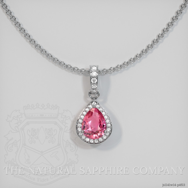 The pendant features a beautiful, transparent Other certified Orangish Pink 1.08 carat pear shape pink sapphire with the dimensions of 7.29 x 5.55 x 3.41 mm and a mixed brilliant cut. It has a clarity grade of very slightly included (evaluated at eye level), intense color saturation, and an excellent polish. The origin of this sapphire is Ceylon (Sri Lanka).