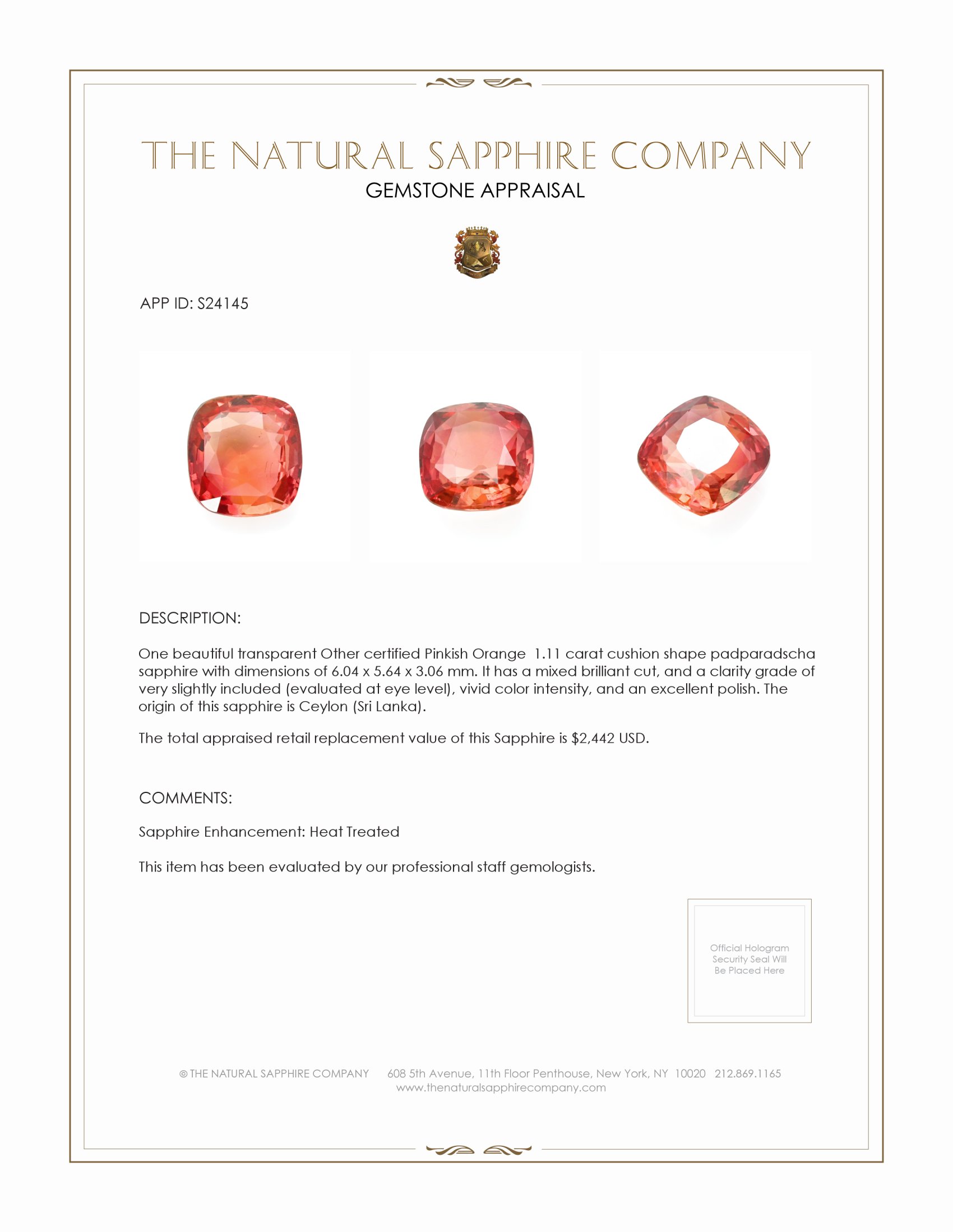 The centerpiece of this remarkable ring is a 1.11 carat cushion-shaped padparadscha sapphire, known for its rare and enchanting color. With dimensions of 6.04 x 5.64 x 3.06 mm, the mixed brilliant cut unveils its vivid hues, ensuring the stone radiates with remarkable color saturation. Sourced from the famous gem lands of Ceylon, Sri Lanka, and enhanced through subtle heat treatment, the sapphire itself tells a timeless story. The clarity, graded as very slightly included, reveals the natural beauty and authenticity every gemstone lover cherishes.