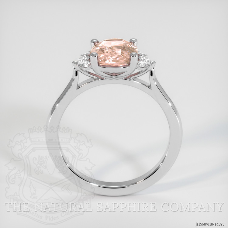 The ring features a beautiful, transparent Other certified Pinkish Orange 1.58 carat cushion shape padparadscha sapphire with the dimensions of 7.42 x 6.64 x 3.32 mm and a mixed brilliant cut. It has a clarity grade of eye clean (evaluated at eye level), medium light color saturation, and an excellent polish. The origin of this sapphire is Ceylon (Sri Lanka).