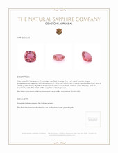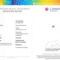 The ring features a beautiful, transparent C.Dunaigre certified Orangy-Pink 1.61 carat cushion shape padparadscha sapphire with the dimensions of 7.07 x 6.89 x 3.63 mm and a mixed brilliant cut. It has a clarity grade of very slightly included (evaluated at eye level), medium intense color saturation, and an excellent polish. The origin of this sapphire is Madagascar.
