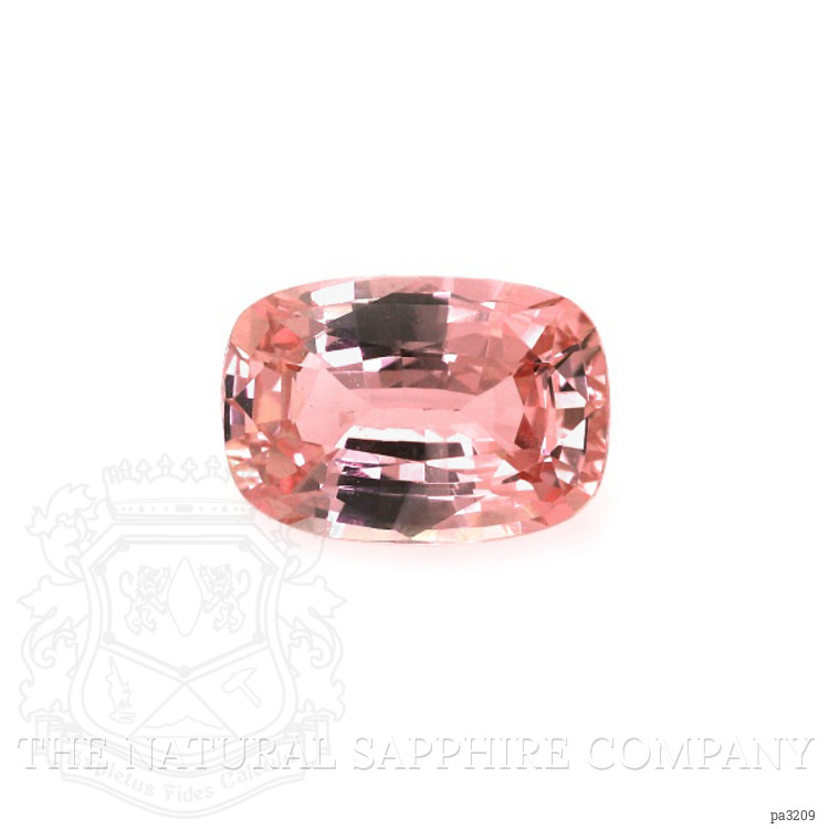 The ring features a beautiful, transparent 2.14 carat cushion shape padparadscha sapphire with the dimensions of 8.78 x 6.09 x 4.14 mm and a mixed brilliant cut. It has a clarity grade of eye clean (evaluated at eye level), medium color saturation, and an excellent polish. The origin of this sapphire is Madagascar.