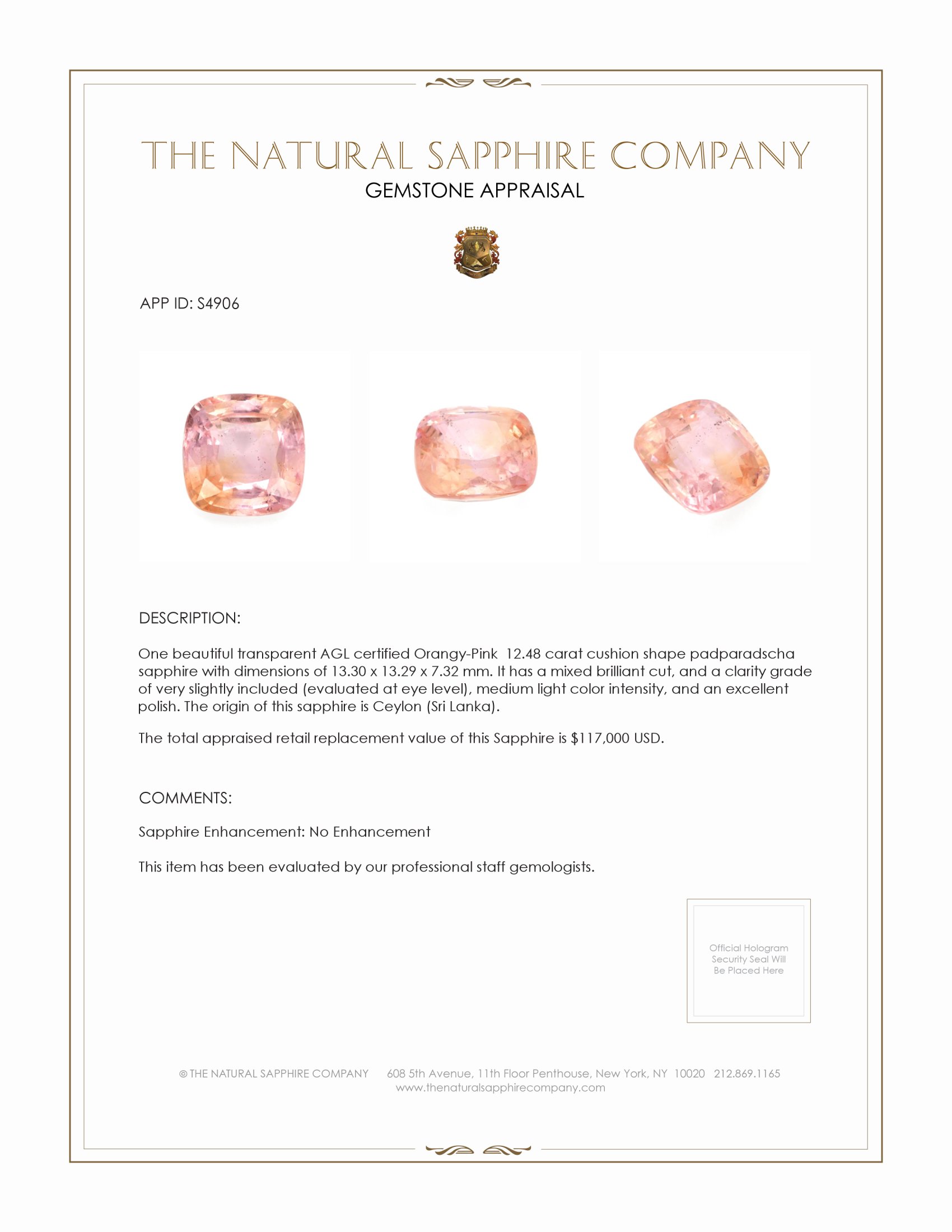 The ring features a beautiful, transparent AGL certified Orangy-Pink 12.48 carat cushion shape padparadscha sapphire with the dimensions of 13.30 x 13.29 x 7.32 mm and a mixed brilliant cut. It has a clarity grade of very slightly included (evaluated at eye level), medium light color saturation, and an excellent polish. The origin of this sapphire is Ceylon (Sri Lanka).