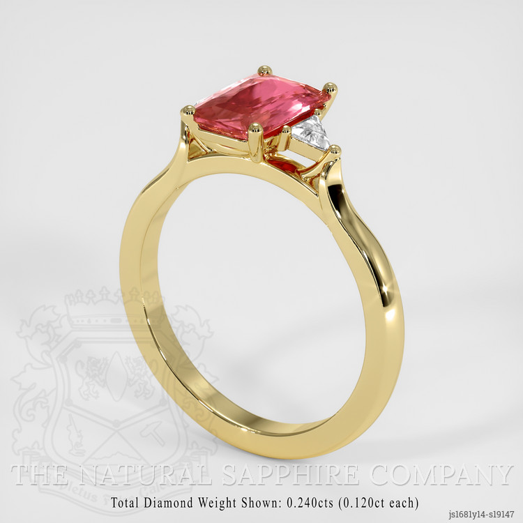 The ring’s design elevates its splendor by incorporating white trillion-shaped natural diamonds, meticulously selected for their supreme quality. Weighing approximately 0.24 carats with a clarity range of VS1 to VS2, these diamonds boast a prestigious color grade of E. Each facet of these dazzling gems reflects brilliance with every movement, beautifully complementing the padparadscha sapphire. The contrast of the radiant sapphire against the clear, pristine diamonds creates an eye-catching allure, setting this ring apart as truly extraordinary.
