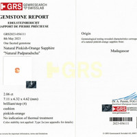 This ring centers a GRS certified Padparadscha sapphire weighing 2.06 carats, cushion shape, with exact measurements of 7.13 by 6.35 by 4.63 millimeters and a mixed brilliant cut, and it presents a clarity grade of very very slightly included as evaluated at eye level, a medium color saturation, and an excellent polish, originating from Madagascar with no enhancement, and the setting is finished in 14K white gold accented by white round natural diamonds of approximately 0.248 carats and 0.297 carats, both grades VS clarity and F slash G color. When you compare the clarity of this padparadscha to other high end rings on the market, the difference is tangible, many premium sapphires of similar hue show more visible inclusions or require heat treatment to improve color and clarity, whereas this stone combines rare eye level cleanliness with natural, untreated color, allowing light to travel through the pavilion and crown with minimal obstruction and producing a lively, even scintillation that rivals many larger but more included stones.