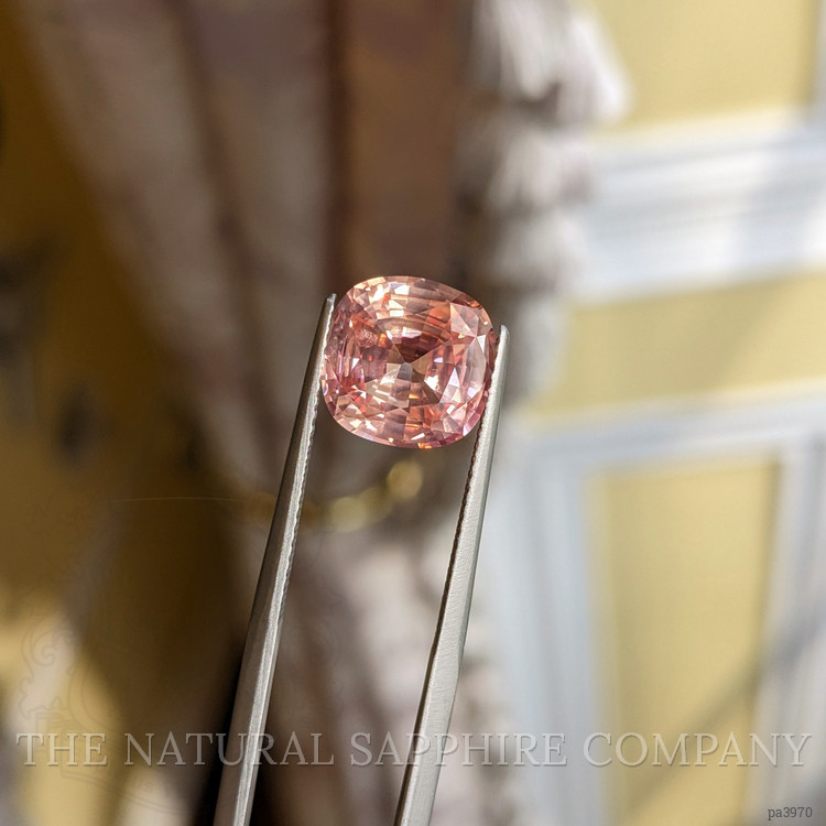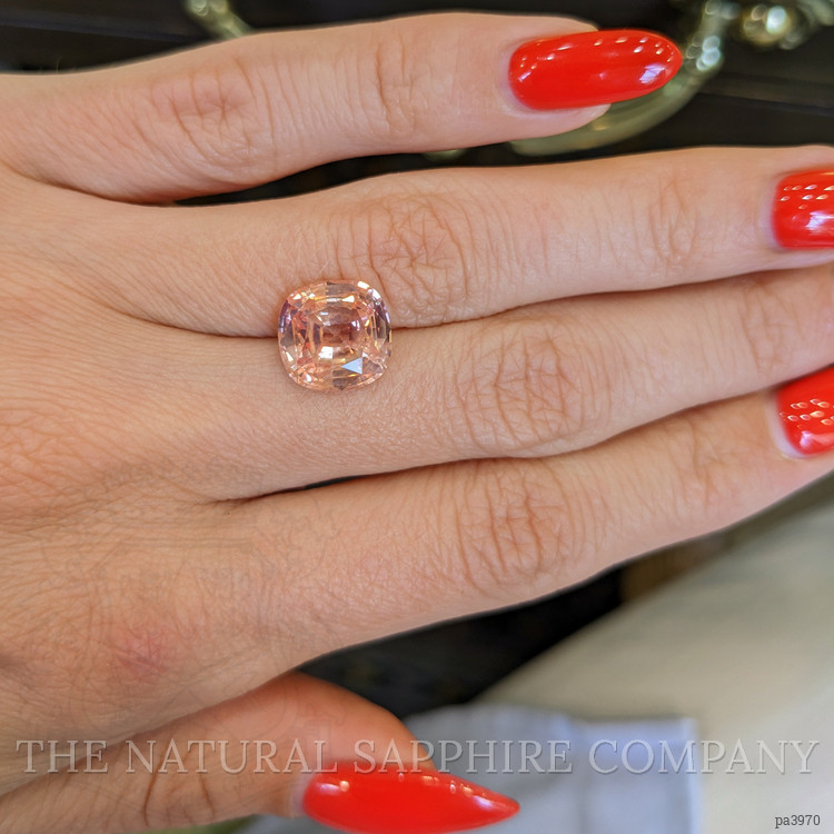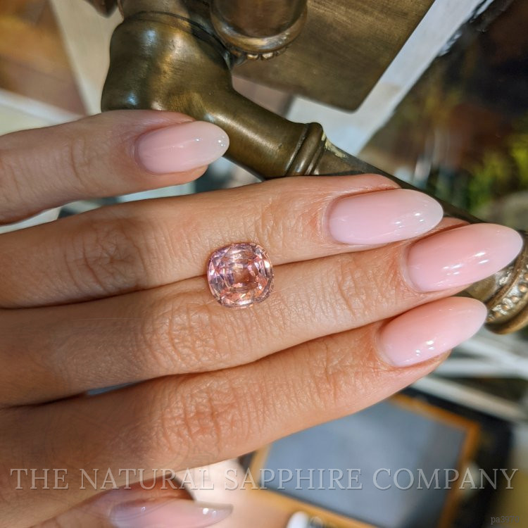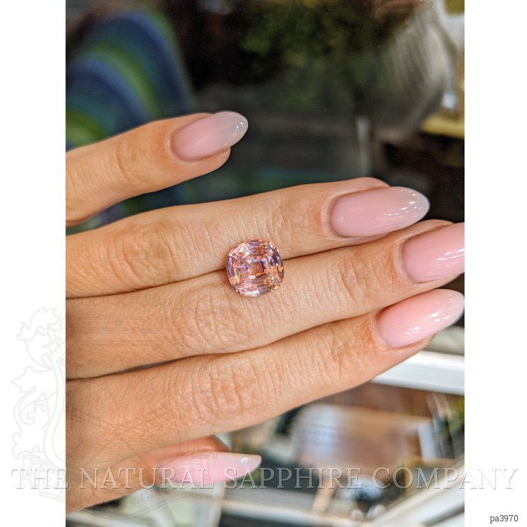The ring features a beautiful, transparent C.Dunaigre certified Pink-Orange 5.19 carat cushion shape padparadscha sapphire with the dimensions of 10.38 x 10.21 x 5.79 mm and a mixed brilliant cut. It has a clarity grade of very slightly included (evaluated at eye level), medium light color saturation, and an excellent polish. The origin of this sapphire is Madagascar.