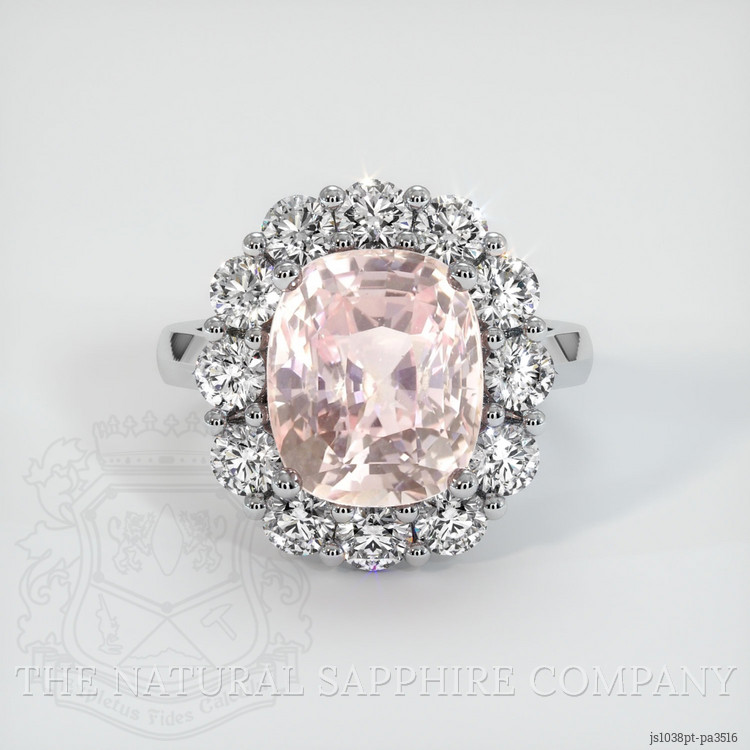 The ring features a beautiful, transparent 5.28 carat cushion shape padparadscha sapphire with the dimensions of 10.34 x 8.66 x 6.88 mm and a mixed brilliant cut. It has a clarity grade of eye clean (evaluated at eye level), medium light color saturation, and an excellent polish. The origin of this sapphire is Ceylon(Sri Lanka).