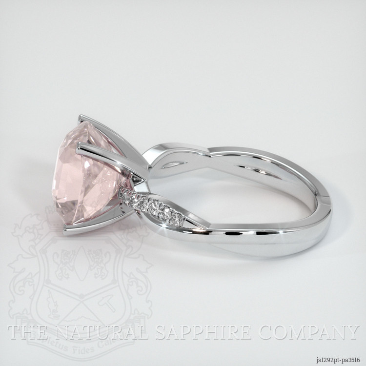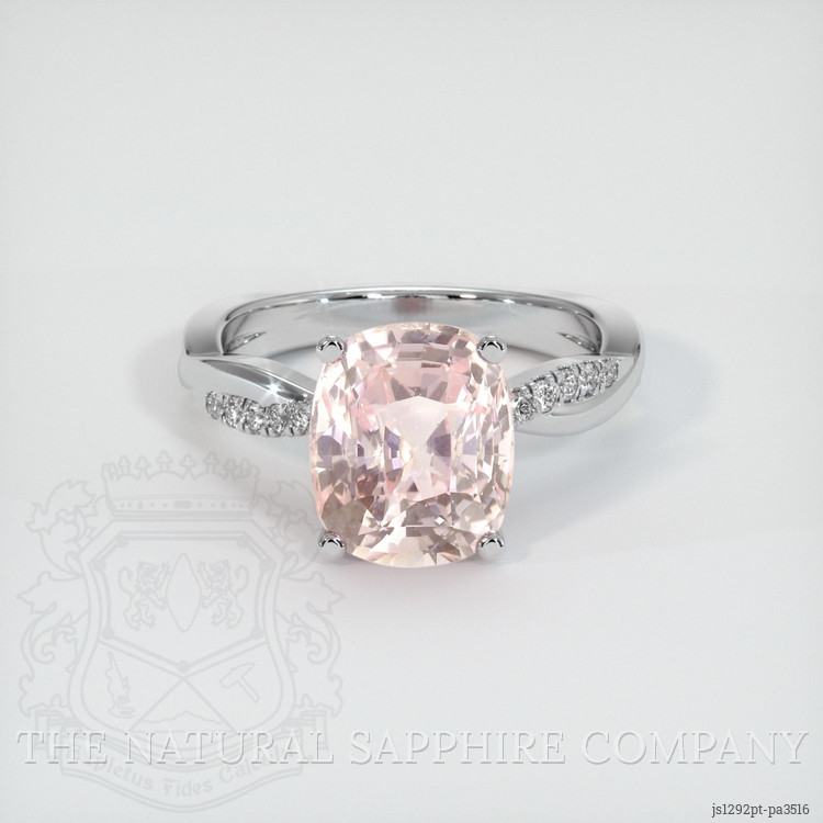 The ring features a beautiful, transparent Other certified Padparadscha 5.28 carat cushion shape padparadscha sapphire with the dimensions of 10.34 x 8.66 x 6.88 mm and a mixed brilliant cut. It has a clarity grade of eye clean (evaluated at eye level), medium light color saturation, and an excellent polish. The origin of this sapphire is Ceylon (Sri Lanka).