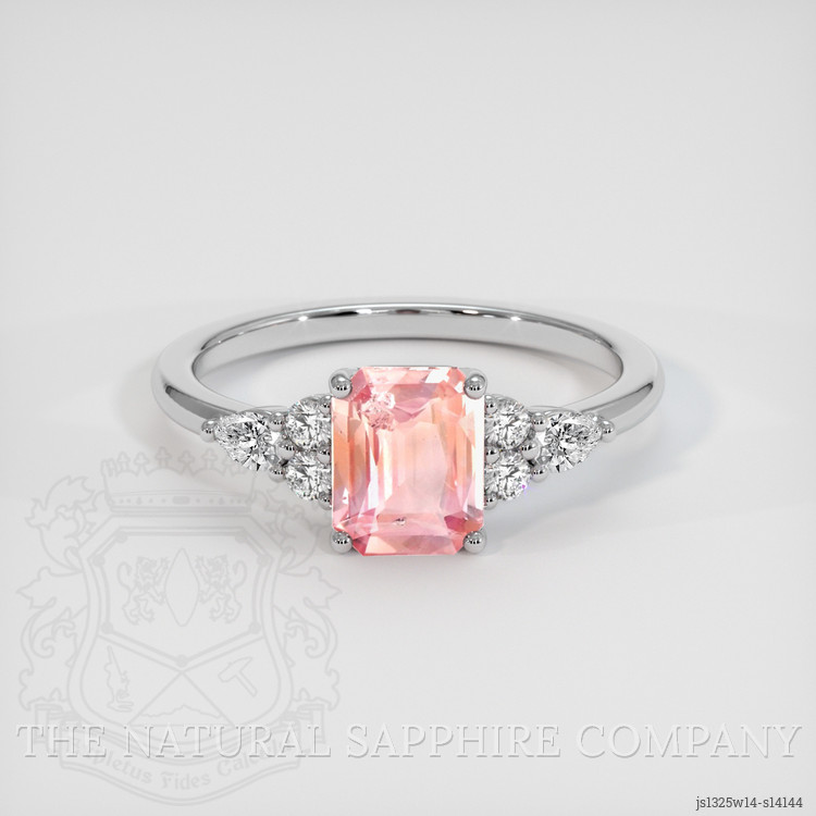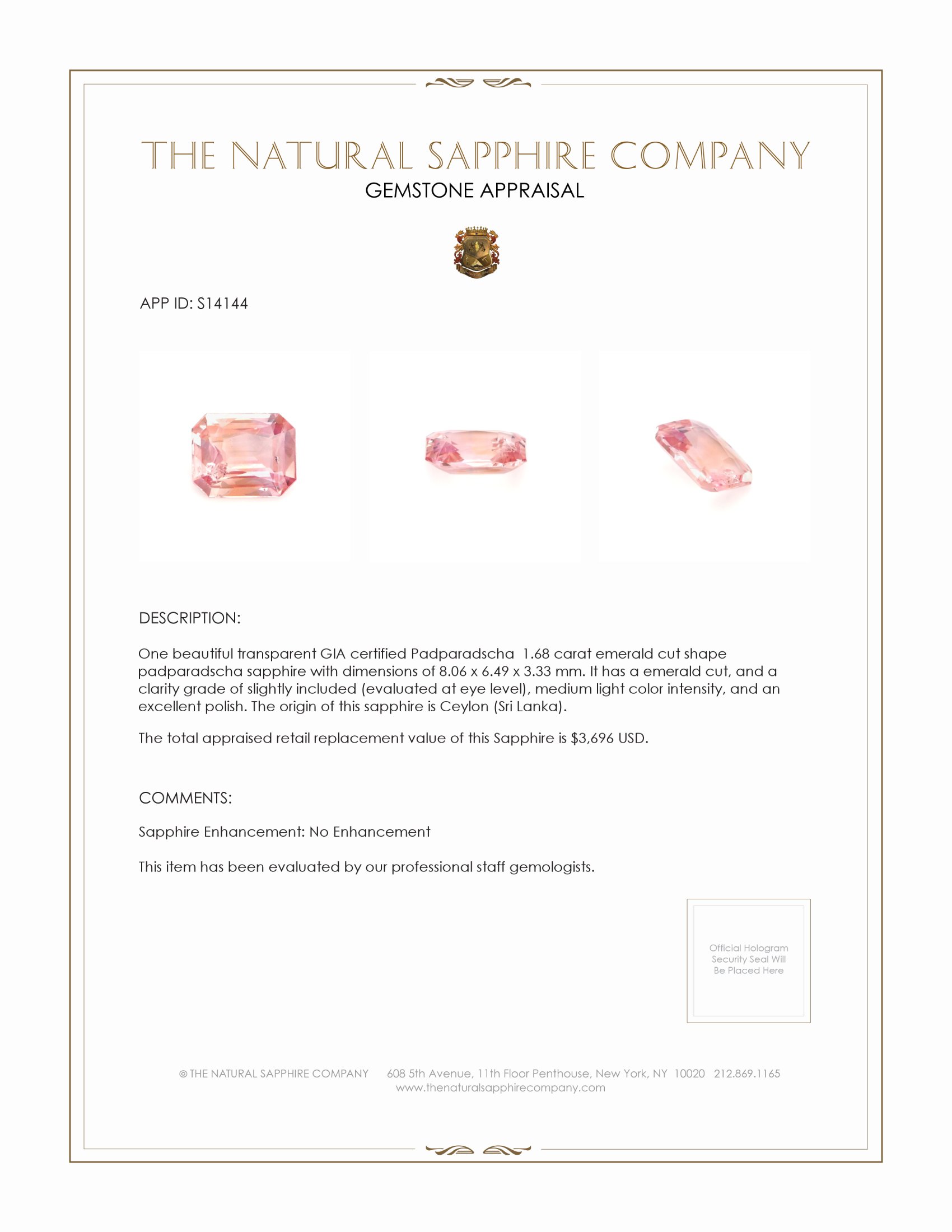 Unearthed from the rich soils of Ceylon, also known as Sri Lanka, the Padparadscha sapphire featured in our exquisite ring is not just a gemstone but a testament to the artistry of nature itself. This 1.68 carat emerald-shaped stone, with dimensions of 8.06 x 6.49 x 3.33 mm, embodies the gentle hues of a tropical sunset, blending pink and orange in perfect harmony. With a medium-light color saturation and eye-visible inclusions, it holds the serenity and mystery of the land it originated from. Its name, deriving from the Sinhalese word for 'lotus blossom', represents a cultural significance that dates back centuries, tying it to tales of beauty and purity in ancient folklore. Now, this magnificent gem has been expertly cut to an emerald shape, creating facets that reflect light with a captivating allure. At The Natural Sapphire Company, we cherish this transformation from a raw piece of the earth to a polished symbol of elegance.