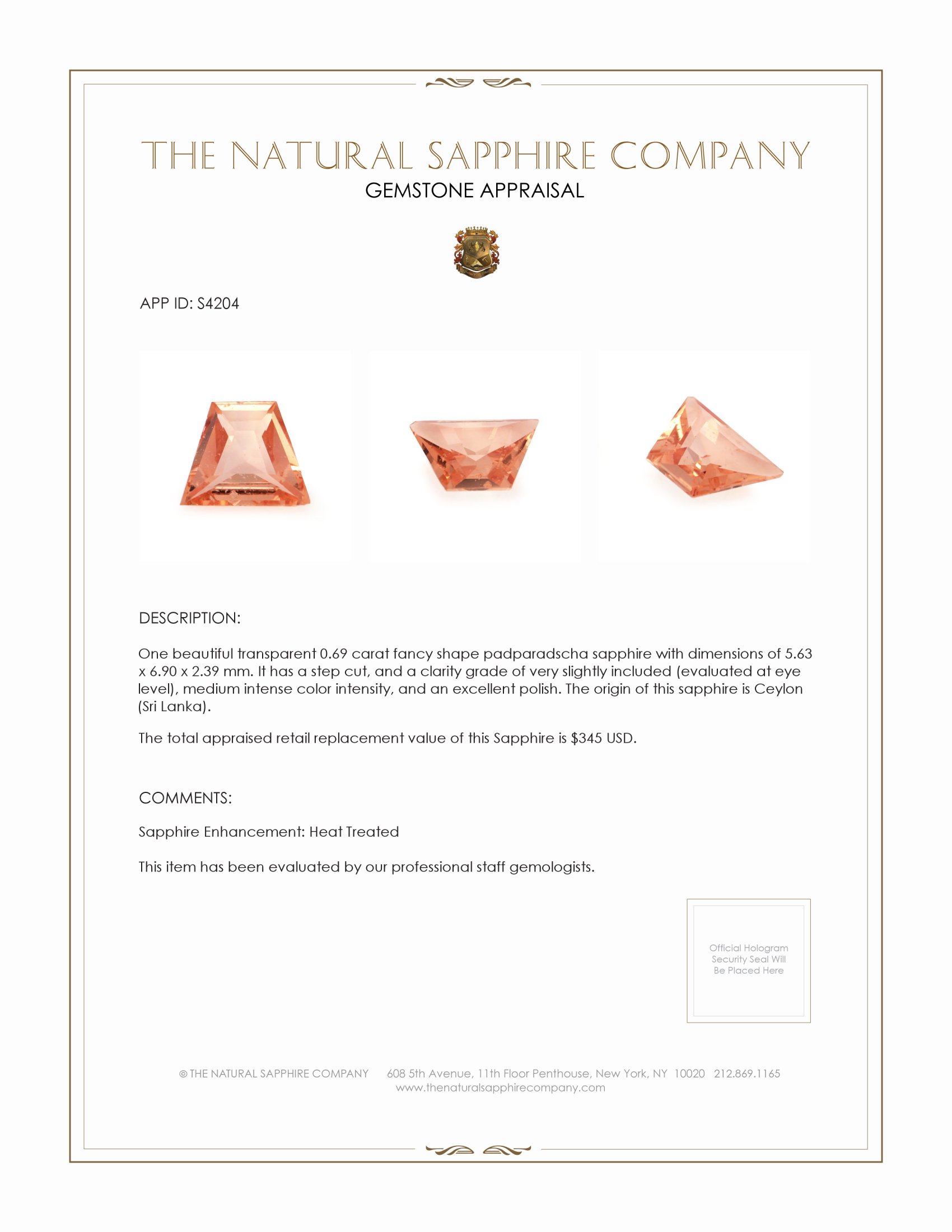 Introducing a masterpiece of elegance and rarity, this exquisite ring from The Natural Sapphire Company features a 0.69 carat fancy shape padparadscha sapphire. With dimensions of 5.63 x 6.90 x 2.39 mm and a meticulous step cut, this gemstone captivates with its unique, transparent allure. Its clarity grade is very slightly included, ensuring that any inclusions are minimal and not visible to the naked eye. The medium intense color saturation further enhances its charm, showcasing the distinct pinkish-orange hue that is emblematic of the finest padparadscha sapphires. This gem's history is rooted in Ceylon, now known as Sri Lanka, a renowned origin for high-quality sapphires. The heat treatment applied to this stone enhances its natural color and clarity, making it a valuable addition to any collection.