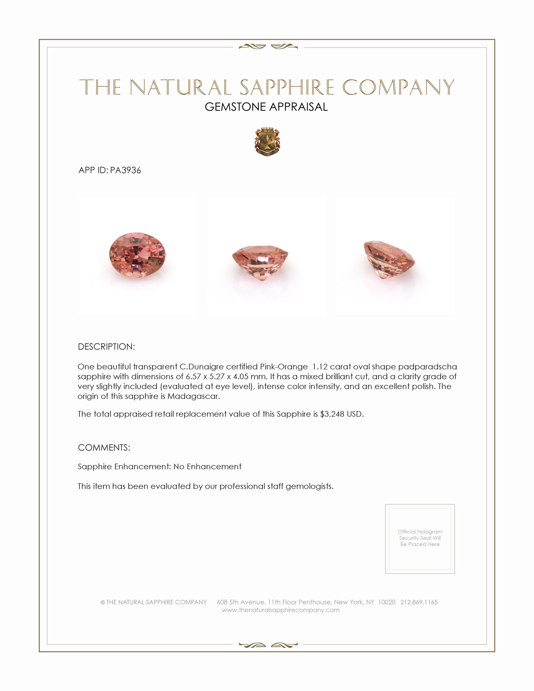 The men's ring features a beautiful, transparent C.Dunaigre certified Pink-Orange 1.12 carat oval shape padparadscha sapphire with the dimensions of 6.57 x 5.27 x 4.05 mm and a mixed brilliant cut. It has a clarity grade of eye clean (evaluated at eye level), intense color saturation, and an excellent polish. The origin of this sapphire is Madagascar.