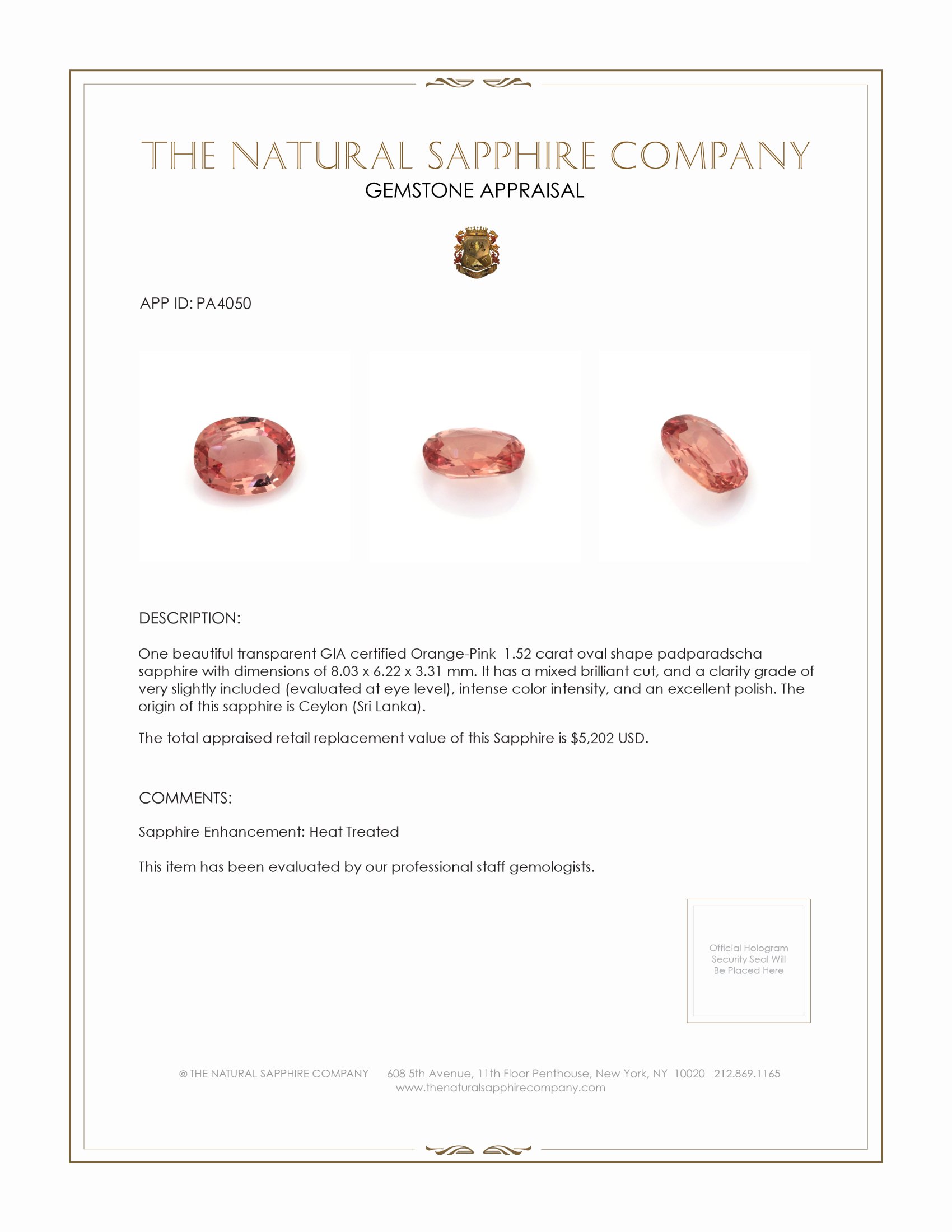 Discover the perfect blend of elegance and individuality with our exquisite padparadscha sapphire ring, exclusively from The Natural Sapphire Company. This masterpiece is more than just a jewelry piece; it’s a reflection of the wearer’s unique personality and style. At its heart lies a magnificent 1.52 carat GIA certified Orange-Pink padparadscha sapphire, sourced from the renowned gem-rich lands of Ceylon, Sri Lanka. Its oval shape complements the mixed brilliant cut, revealing an enchanting clarity grade of very slightly included. The intense color saturation, brought to life through expert heat treatment, captures attention with its vibrant yet subtle glow. This sapphire, with its dimensions of 8.03 x 6.22 x 3.31 mm, has been polished to perfection, solidifying its status as a timeless treasure.