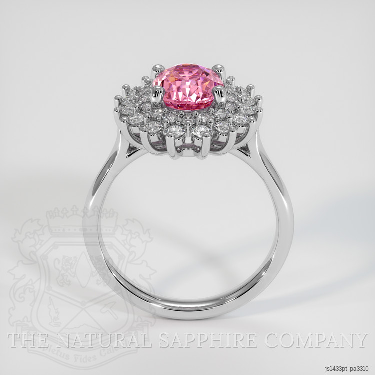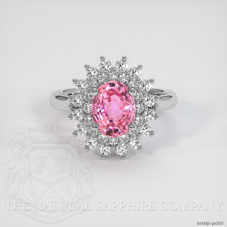 At The Natural Sapphire Company, we take pride in offering gemstones of unparalleled quality, and this exquisite ring is a testament to our commitment to excellence. At the heart of the piece is a stunning GIA certified Padparadscha sapphire, weighing 1.74 carats, which captivates with its translucence and unparalleled beauty. Carefully selected for its medium intense color saturation, the sapphire exhibits a unique blend of pink and orange hues, reminiscent of a serene sunset. Its origin is Ceylon, renowned for producing some of the most treasured sapphires in the world. This Padparadscha is skillfully cut into an oval shape with a mixed brilliant style, which enhances the stone's natural luster and brilliance. The clarity is graded as very slightly included, with any inclusions only visible at eye level, ensuring a stunning, uninterrupted play of light within the stone. Heat treatment, the only enhancement used, preserves the sapphire's natural integrity while optimizing its vibrant color.